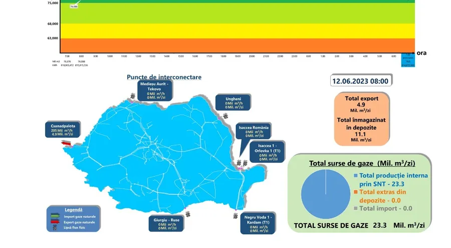 Exporturile de gaze către Ungaria prin gazoductul Arad-Szeged tot cresc, ajungând azi să fie de 4,9 milioane de metri cubi, ceea ce, în condițiile în care nu mai importăm deloc, reprezintă peste 20% din producția internă, care este de 23,3 milioane de metri cubi. Economedia.ro a scris deja că, în iunie, România a devenit net exportatot de gaze, pe fondul sistării importurilor(gazoductul TurkStream, care aduce gaze din Rusia, via Turcia, către sudul Europei și România, este în revizie) și a consumului intern redus. Acum doar constatăm că acest export tot crește. A plecat de la 3,2 milioane metri cubi, la începutul lunii iunie, a ajuns la 3,9, apoi 4,2 și, acum, la 4,9 milioane de metri cubi. În afară de acest export, constatăm, din datele interactive Transgaz, că și stocarea în depozite este la cote mari – 11 milioane metri cubi, azi. Acest lucru înseamnă că tot consumul intern este de 8 milioane de metri cubi (producție totală – export – înmagazinare depozite). Practic, se înmagazinează în subteran mai mult decât consumă toată România și exportul către Ungaria reprezintă 60% din tot consumul intern. În această perioadă, când suntem încă departe de sfârșitul ciclului de stocare gaze – 30 octombrie, depozitele României sunt pline la peste 60%, potrivit Transgaz.