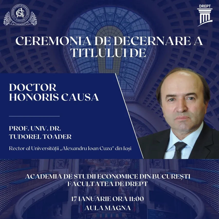 Fostul ministru al Justiției din guvernele PSD în perioada 2017-2019 Tudorel Toader, rector la Iași, primește în 17 ianuarie titlul onorific de Doctor Honoris Causa din partea Academiei de Studii Economice din București, arată un anunț al ASE. Inițiativa vine la propunerea conducerii Facultății de Drept. De profesie avocat, Toader este actualmente profesor universitar, rector al Universității „Alexandru Ioan Cuza” din Iași.