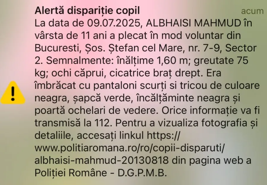 ”Vă rugăm să îl aveţi în atenţie pe Albhaisi Mahmud, în vârstă de 11 ani. Acesta a plecat voluntar în data de 09.07.2025, în jurul orei 19:00, de la adresa din Şos. Ştefan cel Mare nr. 7 – 9 (Stadion Dinamo – bazin de înot) şi nu a mai revenit până în prezent la domiciliul situat pe Şos. Ştefan cel Mare nr. 15”, preciza Primăria.