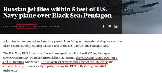 Materialul publicat de CBS News pe 30 ianuarie 2018 despre incidentul aerian deasupra Mării Negre cu implicarea altui Su-27 și a aeronavei americane EP-3 Aries (Sursa: CBS News)