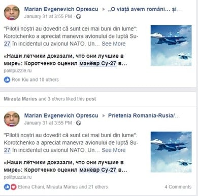 Captură după distribuirea articolelor propagandistice traduse și distribuite pe grupuri pro-Kremlin de utilizatorul Marian Oprescu (Sursa: Facebook)