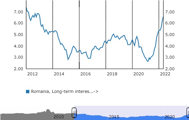 Rata dobânzii pe termen lung (10 ani, de referință) pentru România a crescut la 6,61%, în aprilie 2022, de la 6,20%, în martie. Acesta este cel mai mare nivel la care se împrumută România din ultimii zece ani, arată datele BCE. România s-a împrumutat ultima dată la dobânzi mai mari în decembrie 2012, când rata dobânzii era de 6,65%.