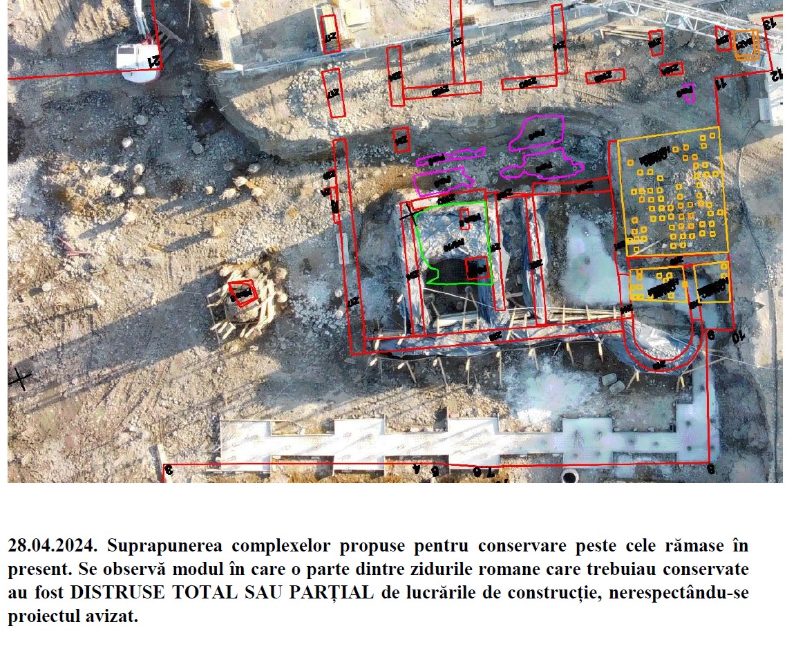 Potrivit acesteia, este vorba despre ”un zid întreg al casei romane și porțiuni de ziduri dispărute, spectaculoasa absidă a băii romane, de asemenea, vestigii aflate în zonele imediat învecinate implantării piloților hotelului”.