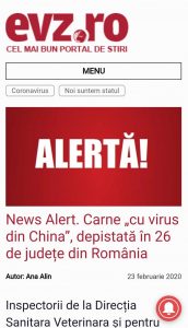 Autoritatea Națională Sanitară Veterinară și pentru Siguranța Alimentelor (ANSVSA) denunță un articol publicat, duminică, de „Evenimentul Zilei”, cu alertă și titlul: „Carne «cu virus din China» a fost depistată în 26 de județe din România”, care făcea referire la un anunț din urmă cu peste o lună al ANSVSA privind retragerea de la comercializare a unor produse din carne provenite din Ungaria, unde a apăruse un focar de gripă aviară. „Se generează o stare de panică nejustificată în rândul populației”, precizează Autoritatea într-un comunicat de presă.