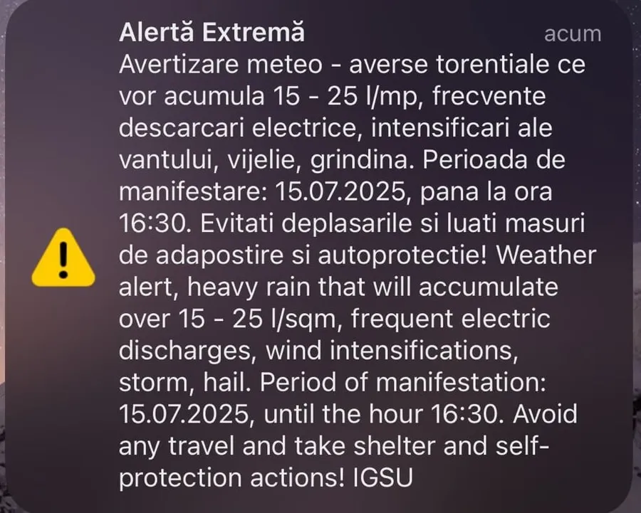 Autoritățile au emis marți după-amiază o avertizare RO-Alert de furtună în Sibiu. Vor fi averse torențiale, frecvente descărcări electrice, intensificări ale vântului, vijelie, grindină.