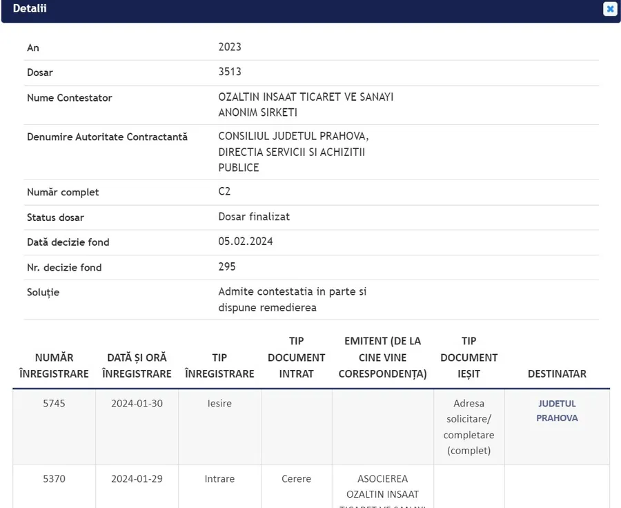 Consiliul Județean Prahova nu poate semna contractul de aproximativ 600 de milioane lei pentru Centura Bușteni – Azuga cu antreprenorul prahovean Coni (care lucrează pe Autostrada Moldovei) după ce Consiliul Național pentru Soluționarea Contestațiilor a admis, în parte, contestația Ozaltin (Turcia), constructor care lucrează pe primul lot al Drumului Expres Craiova – Pitești. Astfel, Consiliul Județean Prahova trebuie să reevalueze ofertele, potrivit deciziei CNSC pe care a consultat-o Economedia. Contestația Ozaltin a fost depusă pe 15 decembrie 2023, iar analiza a durat aproape două luni.
