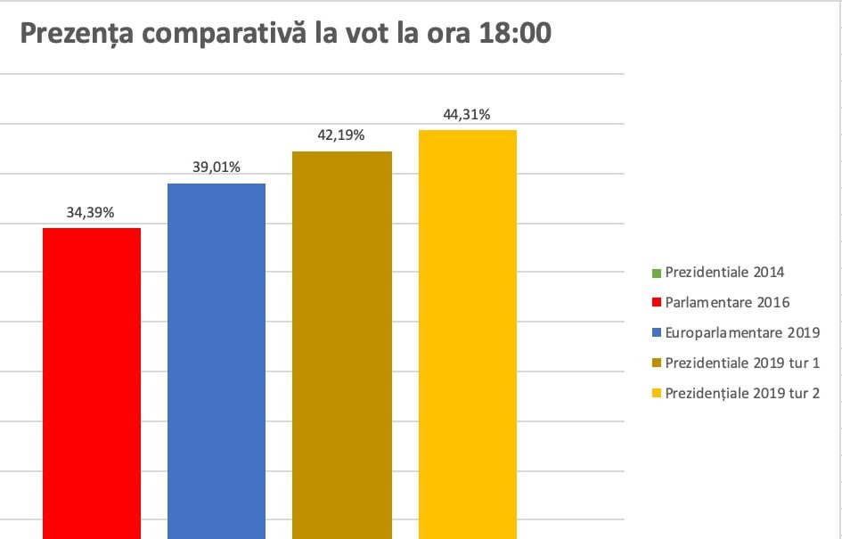 Prezența la vot în turul 2 al prezidențialelor a ajuns la ora 18:00 la 44,31%, cu peste două puncte procentuale mai mare decât în turul întâi (42,19%), potrivit datelor BEC. Prezența de astăzi o depășește și pe cea înregistrată la europarlamentarele din mai 2019, dar și pe cea de la parlamentarele din 2016.