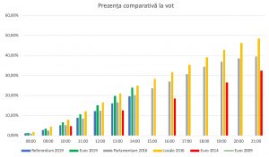 La ora 14:00, prezența la vot era de 23,91% la alegerile europarlamentare și de 19,61% la referendum. Românii au ieșit la vot în număr semnificativ mai mare decât la alegerile parlamentare din 2016, când la ora 14.00 se înregistra o prezență de 20,2%.
