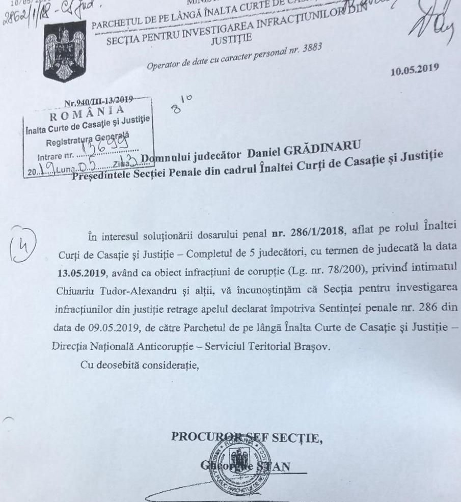 Secția specială de investigare a magistraților (SIIJ), condusă de Gheorghe Stan, a retras luni apelul în dosarul de corupție în care Viorel Hrebenciuc fusese condamnat la doi ani de închisoare în primă instanță, potrivit unui document depus azi la Înalta Curte. Este o decizie fără precedent, Retragerea apelului e irevocabilă.