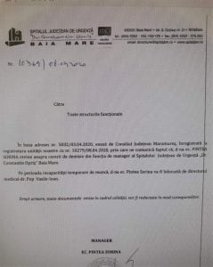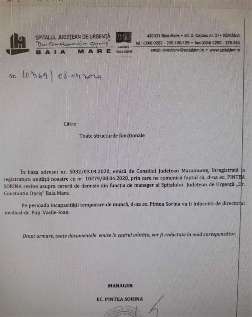 ”În baza adresei nr. 5032 / 3.04.2020, emisă de Consiliul Județean Maramureș, înregistrată la registratura unității noastre cu nr. 10279/08.04.2020, prin care ne comunică faptul că d-na ec. Pintea Sorina revine asupra cererii de demisie din funcția de manager al Spitalului Județean de Urgență ”Dr. Constantin Opriș” Baia Mare. Pe perioada incapacității temporare de muncă, d-na ec. Pintea Sorina va fi înlocuită de directorul medical, dr. Pop Vasile-Ioan”, se arată într-o adresă transmisă astăzi de Sorina Pintea către structurile din subordinea spitalului.