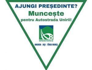 Asociația ”Împreună pentru A8” a demarat o campanie inedită prin care le cere candidaților la alegerile prezidențiale să-și asume construirea autostrăzii Iași – Târgu Mureș. Pe panourile de afișaj electoral, printre afișele candidaților au fost lipiste autocolante inscricționate cu mesajul ”AJUNGI PREȘEDINTE? MUNCEȘTE pentru Autostrada Unirii /A8!”
