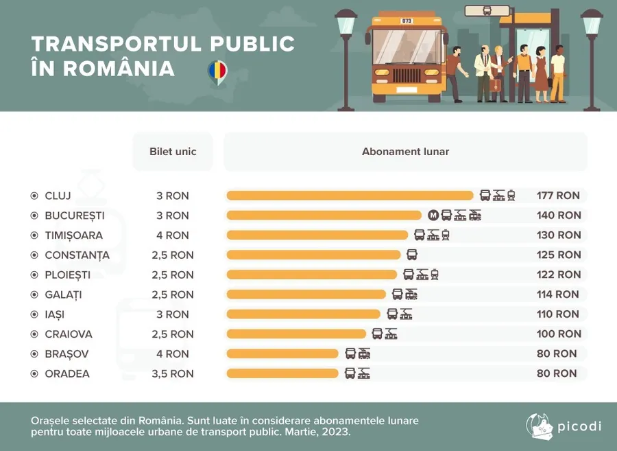 Timișoara și Brașov sunt orașele cu cele mai scumpe bilete de transport, de 4 lei, în timp ce în Constanța, Iași, Ploiești și Galați costul biletelor este cel mai mic, de 2,5 lei, arată o analiză a platformei Picodi.com.