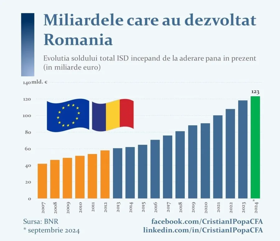 Am arătat recent că, la finalul anului 2023, soldul investițiilor străine directe (ISD) în România a depășit 118 miliarde de euro, echivalentul a aproximativ 36,4% din PIB, evidențiind avantajele unei economii deschise și conectate la piața globală. Cele mai recente date, din toamna acestui an, indică o valoare chiar mai mare, de 123 miliarde de euro, o triplare față de nivelul înregistrat la sfârșitul anului 2007.