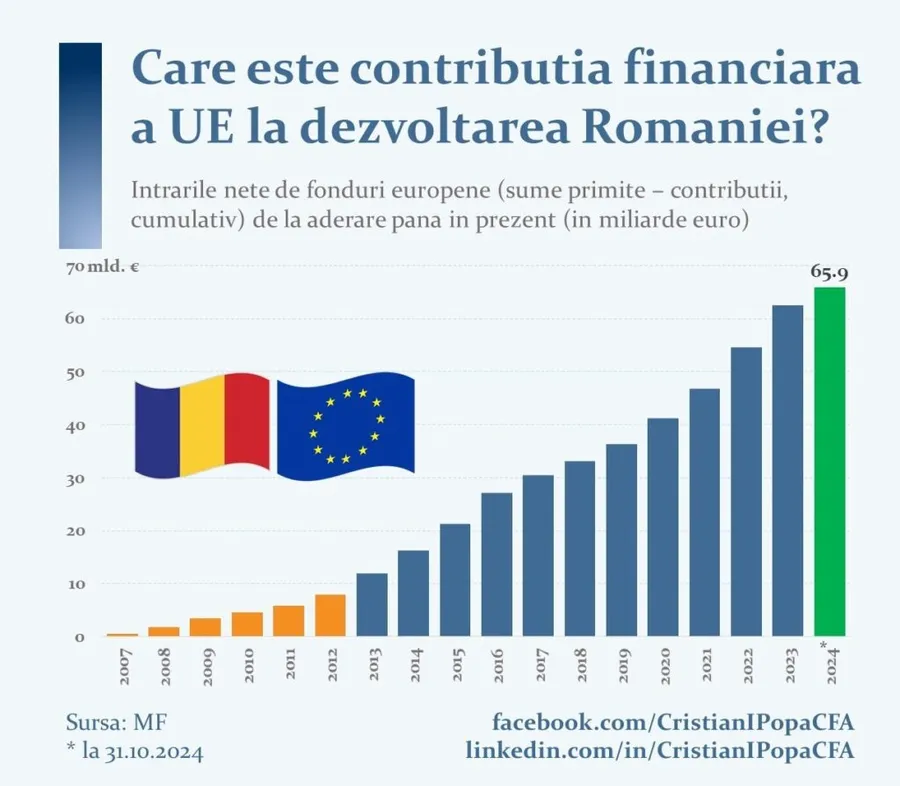 Să începem cu fondurile europene, mai exact cu imaginea completă a fluxurilor financiare dintre România și UE. De la aderare și până în prezent, România a atras fonduri europene în valoare de 97,9 miliarde de euro. Aproape 100 de miliarde de euro. În aceeași perioadă, contribuția României la bugetul Uniunii Europene a fost de aproximativ 32 de miliarde de euro. Calculul este simplu, iar rezultatul este impresionant: România a beneficiat de intrări nete de fonduri europene în valoare de 65,9 miliarde de euro în intervalul 2007 – octombrie 2024. Pentru context, întreg PIB-ul României în 2005 era de aproximativ 80 miliarde de euro.