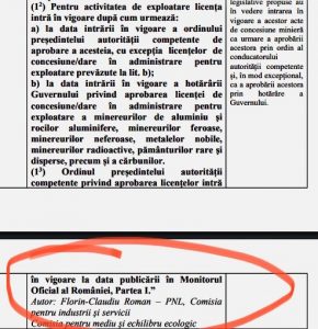 La Camera Deputaților însă, în Comisiile pentru industrii și servicii și pentru mediu și echilibru ecologic, deputatul PNL Florin Roman a introdus un amendament potrivit căruia licențele de exploatare nu mai trebuie aprobate prin HG de către Guvern, ci direct de către președintele ANRM, cu excepția licențelor care vizează exploatarea aluminiului, minereurilor feroase, neferoase, nobile sau radioactive, a pământurilor rare și disperse, precum și a cărbunilor.