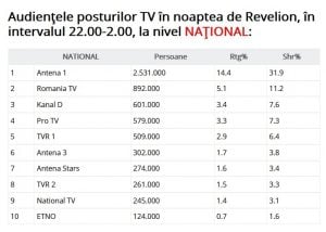 Dacă Dan Negru pe primul loc de Revelion, la mare distanță, nu mai este o surpriză de …21 de ani, interesant este ce s-a întâmplat pe pozițiile următoare: locul al doilea pentru România TV la nivelul întregii țări și la orașe și intrarea în Top 5 a postului public TVR 1.