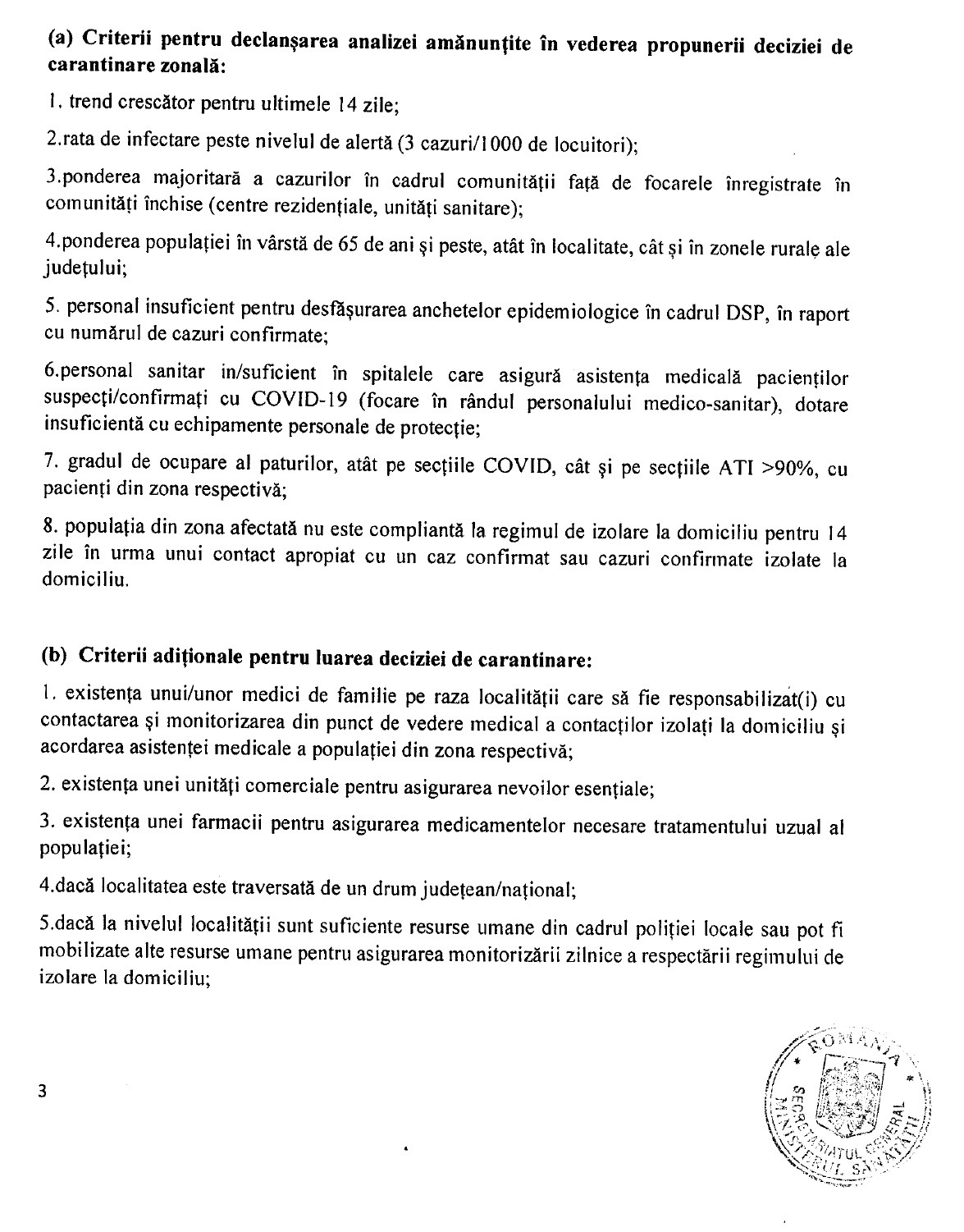 Ministrul Sănătății, Nelu Tătaru, a semnat un ordin care stabilește criteriile pentru carantinarea unei localități din cauza epidemiei de coronavirus, între care: 14 zile cu trend crescător al epidemiei, peste 3 cazuri la mia de locuitori, personal sanitar insuficient, gradul de ocupare al paturilor în secțiile COVID de peste 90%, nerespectarea de către populație a izolării la domiciliu.