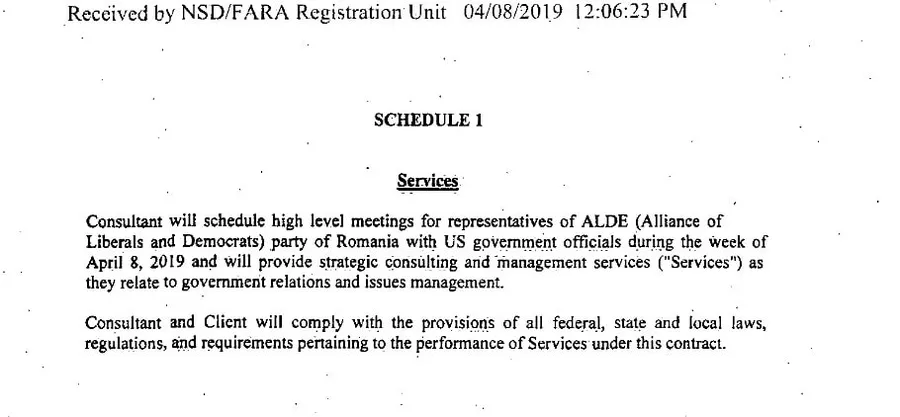 ALDE a contractat cu câteva zile înainte de vizita lui Călin Popescu Tăriceanu în Statele Unite serviciile unui firme de lobby, rezultă din contractul înregistrat oficial în data de 8 aprilie pe site-ul Departamentului de Justiție. Contractul, în valoare de 50.000 de dolari, plătibili în trei tranșe, prevede fără echivoc faptul că firma de consultanță se obligă să aranjeze ”întâlniri între reprezentanții ALDE România cu oficiali guvernamentali în timpul săptămânii din 8 aprilie”.