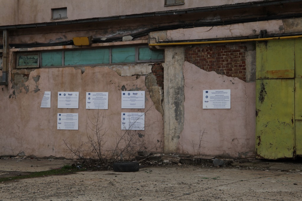 Singurele lucruri care aminteau de proiectele europene erau zecile de plăcuțe informative obligatorii, aliniate pe zidul frontal al halei, dar și pe unul lateral. Unele panouri zăceau rupte, pe jos.