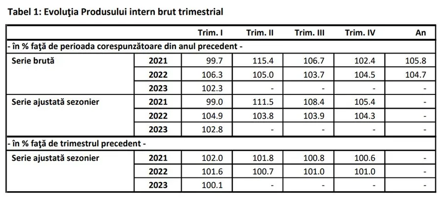 Produsul Intern Brut (PIB) al României a fost în trimestrul 1, în termeni reali, mai mare cu 0,1% comparativ cu trimestrul IV din 2022, arată estimările semnal publicate azi de Institutul Național de Statistică (INS). În T4 față de T3 creșterea fusese de 1%. Faţă de acelaşi trimestru din anul 2022, PIB-ul a înregistrat în trimestrul I 2023 o creștere cu 2,3% pe seria brută şi cu 2,8% pe seria ajustată sezonier. INS precizează că seria ajustată sezonier a PIB trimestrial a fost recalculată ca urmare a includerii estimărilor pentru trimestrul I 2023, fiind înregistrate diferenţe faţă de varianta publicată în 7 aprilie.
