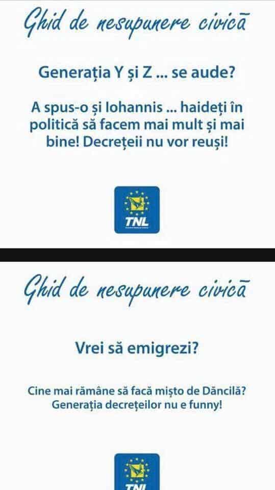 Mara Mareș a publicat miercuri pe pagina personală și pe pagina TNL de Facebook o serie de imagini cu un așa-numit „Ghid de nesupunere civică”, care conțineau mesaje de tipul „Generația Y și Z… se aude? A spus-o și Iohannis… haideți în politică să facem mai mult și mai bine! Decrețeii nu vor reuși!” sau ”Vrei să emigrezi? Cine mai rămâne să facă mișto de Dăncilă? Generația decrețeilor nu e funny!”