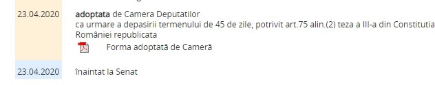 Deschideti „punct de vedere negativ de la guvern”(e in culoare albastru in articol, mai sus!) si gasiti: Avizul negativ, de RESPINGERE de la Guvern a plecat in 14 Aprilie 2020 si a fost INREGISTRAT la Secretariatul general al Camerei Deputatilor in 16 Aprilie 2020, deci cu 7(SAPTE!) ZILE inaintea Termenului de Adoptare tacita la Camera Deputailor care a fost 23 Aprilie 2020, Data la care Proiectul a fost TRIMIS la Senat, camera Decizionala!