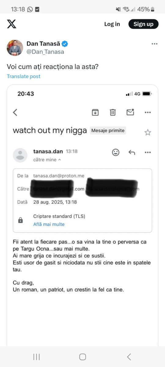 Deputatul AUR Dan Tanasă a postat pe rețeaua X un presupus mesaj de amenințare pe care l-ar fi primit, însă adresa de e-mail a expeditorului conține numele său.