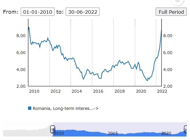 Rata dobânzii pe termen lung (10 ani, de referință) pentru România a crescut la 8,74% în luna iunie, arată datele BCE. Dacă în aprilie România se împrumuta în medie cu dobânzi de 6,61%, costul împrumuturilor a crescut la 7,84% în luna mai, potrivit BCE. România s-a împrumutat ultima dată la dobânzi mai mari în ianuarie 2010, când rata dobânzii era de 9,05%.