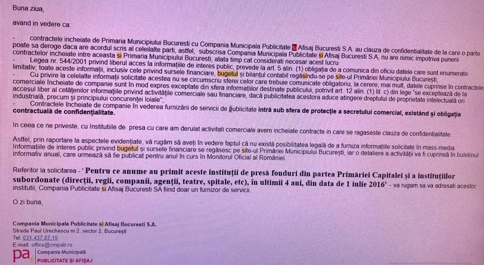 Foto: răspunsul Companiei Publicitate și Afișaj la solicitarea G4media.ro