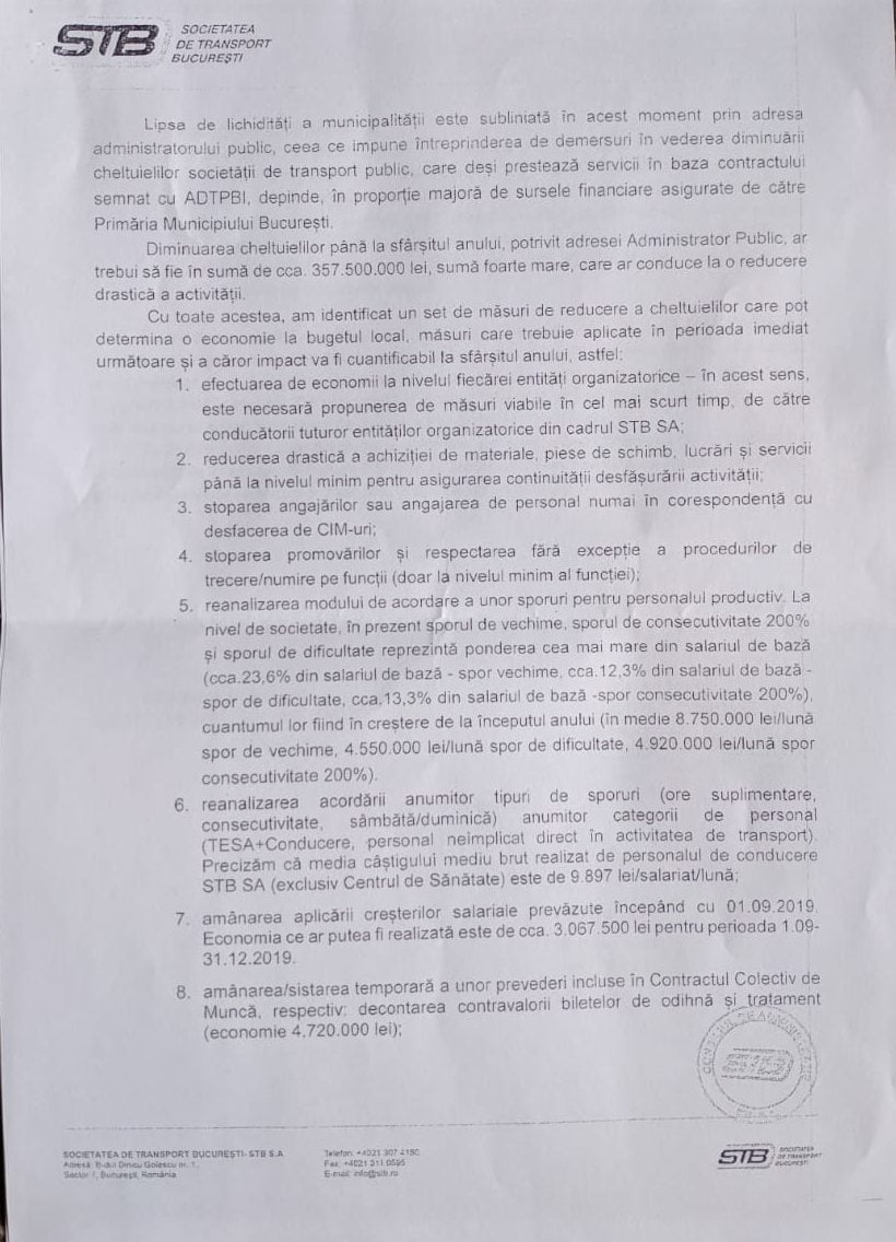 Documentul intern consultat de G4Media.ro se numește ”Informare privind necesitatea implementării unui plan de măsuri de reducere a cheltuielilor la STB SA în anul 2019” și are 8 puncte: