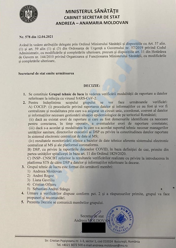 Prin document se decidea înființarea unui ”grup tehnic de lucru” care urma să verifice ”modalitatea de raportare a datelor referitoare la infecția cu virusul SARS-CoV-2”.