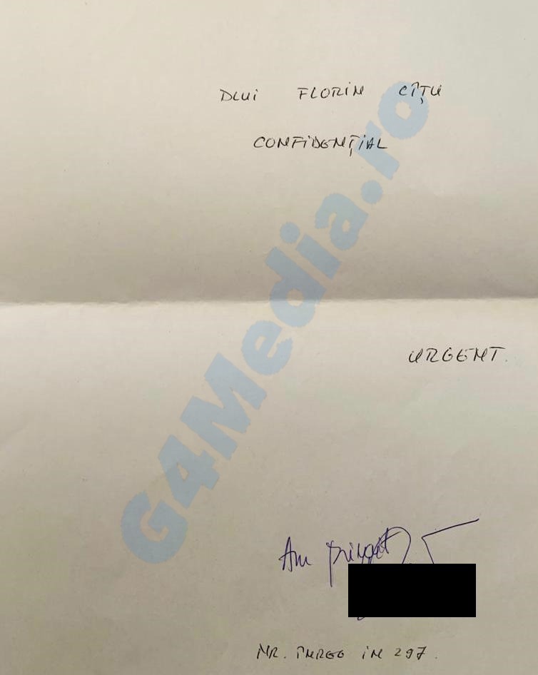 Pe una dintre cele două pagini este scris mesajul ”Dlui. Florin Cîțu. Confidențial” și este semnată cu mențiunea ”Am primit”.