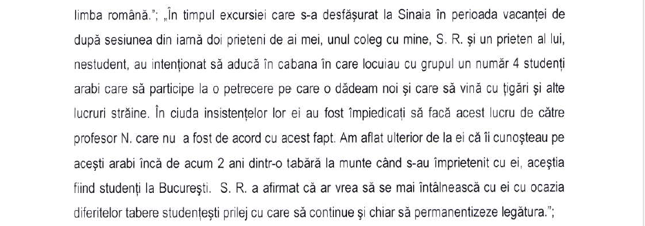 Nu în ultimul rând, întors de la munte, din vacanța de după sesiunea de iarnă, Mihăescu povestește Securității cum ”doi prieteni” ai săi au vrut să aducă la o petrecere patru studenți arabi, dar că un profesor s-a opus vehement. Mihăescu își trage de limbă prietenii și află că aceștia aveau o relație veche de vreo doi ani cu arabii și că ar fi vrut să ”permanentizeze” prietenia cu ei, informații care ajung la Securitate cu ajutorul notelor scrise de ”prietenul” lor, Mugur Mihăescu.