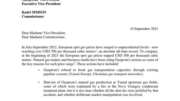 Fostul ministru polonez de Externe și actual europarlamentar semnatar al scrisorii, Anna Fotyga, susține că Gazprom a refuzat în mod deliberat cererea făcută în vară „de a crește volumul de gaze pentru aprovizionarea rezervelor europene în vederea iernii” (rezervele sunt acum la 75% din capacitatea lor, cel mai scăzut nivel din ultimii zece ani); iar acest lucru se întâmplă „în ciuda informațiilor disponibile conform cărora gigantul rus ar avea suficientă capacitate de producție” pentru a satisface cererea.