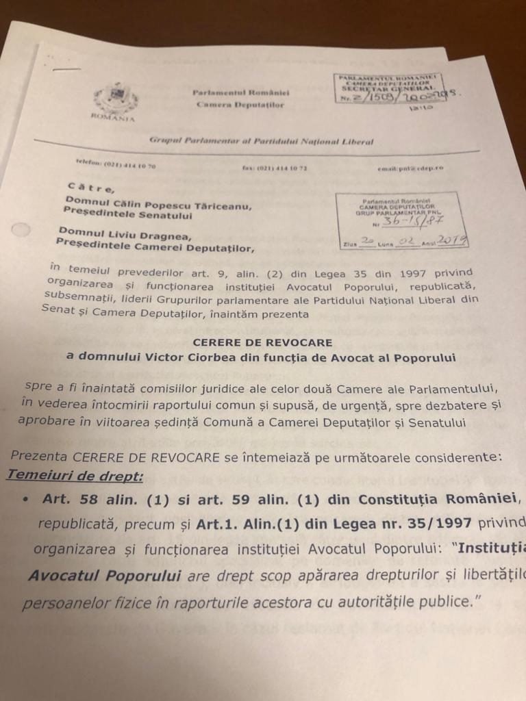 PNL anunță că a depus la conducerea celor două camere ale Parlamentului (Biroul Permanent Reunit) o cerere de revocare a lui Victor Ciorbea din funcția de Avocat al Poporului, acuzându-l că ” blochează orice ar putea pune în pericol interesele penale ale lui Dragnea”. Liderul deputaților PNL, Raluca Turcan, a mai declarat, miercuri, că liberalii solicită Avocatului Poporului să sesizeze OUG care modifică legile justiției la Curtea Constituțională, precizând că liberalii nu au încredere că Victor Ciorbea va da curs solicitărilor PNL.