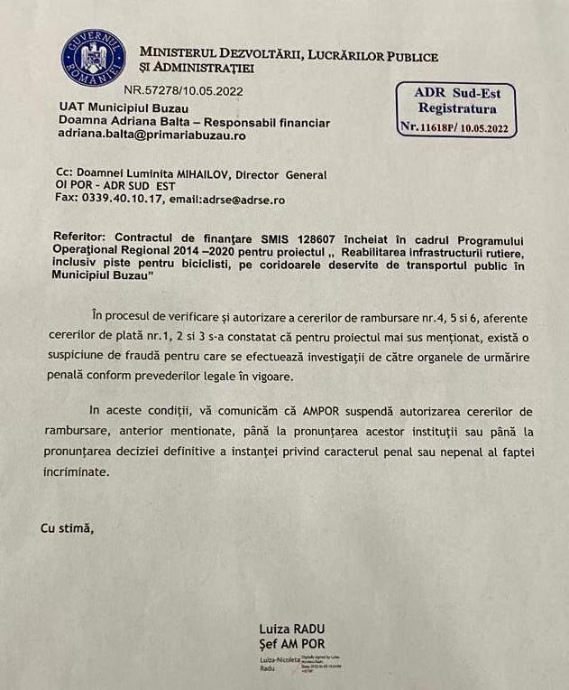 Pe 10 mai 2022, şefa Autorităţii de Management a Programului Operaţional Regional 2014-2020 din cadrul Ministerului Dezvoltării, Luiza Radu, a informat UAT Municipiul Buzău că au fost suspendate plăţile din cadrul contractului de finanțare pentru proiectul ”Reabilitarea infrastructurii rutiere, inclusiv piste pentru bicicliști, pe coridoarele deservite de transportul public în municipiul Buzău” pe motiv că „există o suspiciune de fraudă pentru care se efectuează investigaţii de către organele de urmărire penală”. Contractul este în valoare de peste 88 de milioane de lei.