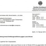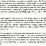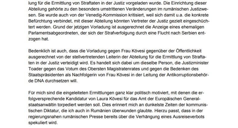 Din punctul meu de vedere, investigațiile demarate, prin intermediul cărora să fie împiedicată candidatura cu șanse de succes a Laurei Köveși pentru funcția de procuror general european, sunt foarte clar motivate politic. Aceasta îmi amintește de timpurile cele mai negre ale dictaturii comuniste, pe care le credeam depășite și în România. Tot aici se încadrează și faptul că în presa românească apropiată Guvernului se speculează deja despre impunerea unei interdicții de a părăsi țara.