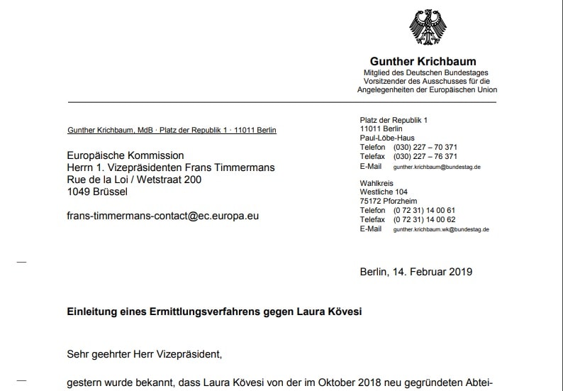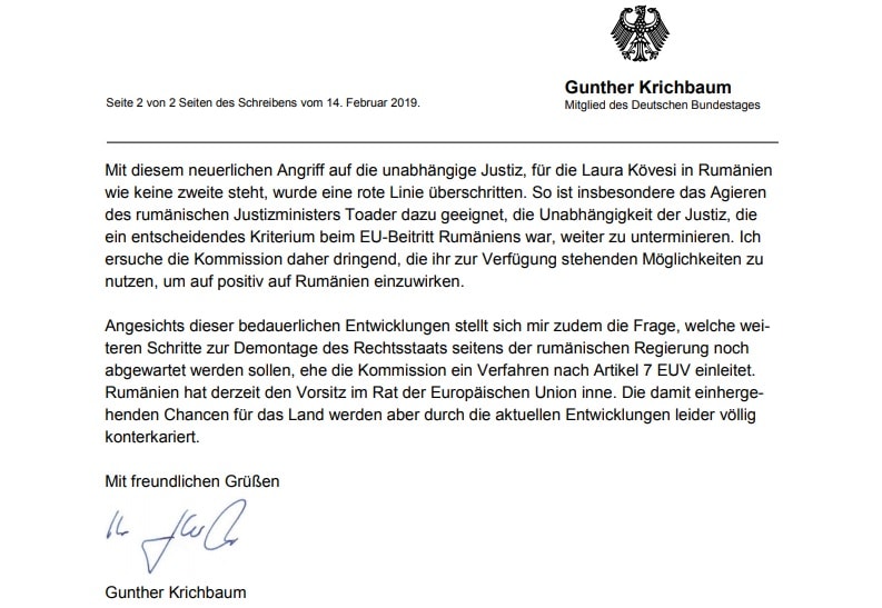 Gunther Krichbaum, președintele comisiei pentru Afaceri Europene din Bundestag-ul german și un bun cunoscător al situației din România, i-a trimis joi o scrisoare prim-vicepreședintelui Comisiei Europene, Frans Timmermans, în care critică dur guvernul României pentru investigarea Laurei Codruța Kovesi de către secția pentru magistrați. Krichbaum îi cere voalat lui Timmermans să declanșeze procedura care a început deja în cazul Poloniei: ”ce alți pași viitori în direcția demontării statului de drept se mai așteaptă din partea Guvernului României până când Comisia va declanșa procedura pentru activarea Articolului 7 al Tratatului Uniunii Europene?”