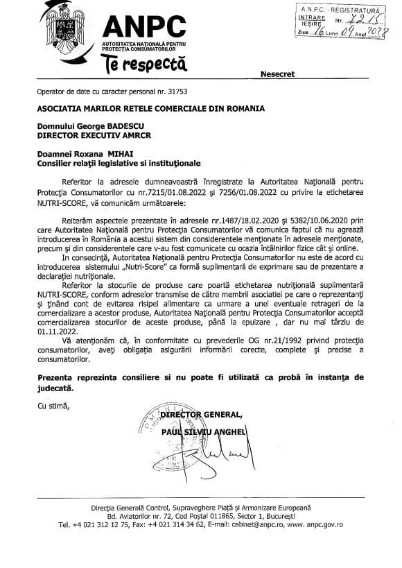 Mai mult, ANPC le transmitea în adresă comercianților că acceptă vânzarea până la epuizare a stocurilor de produse etichetate nutriscore, dar nu mai târziu de 1 noiembrie anul curent.
