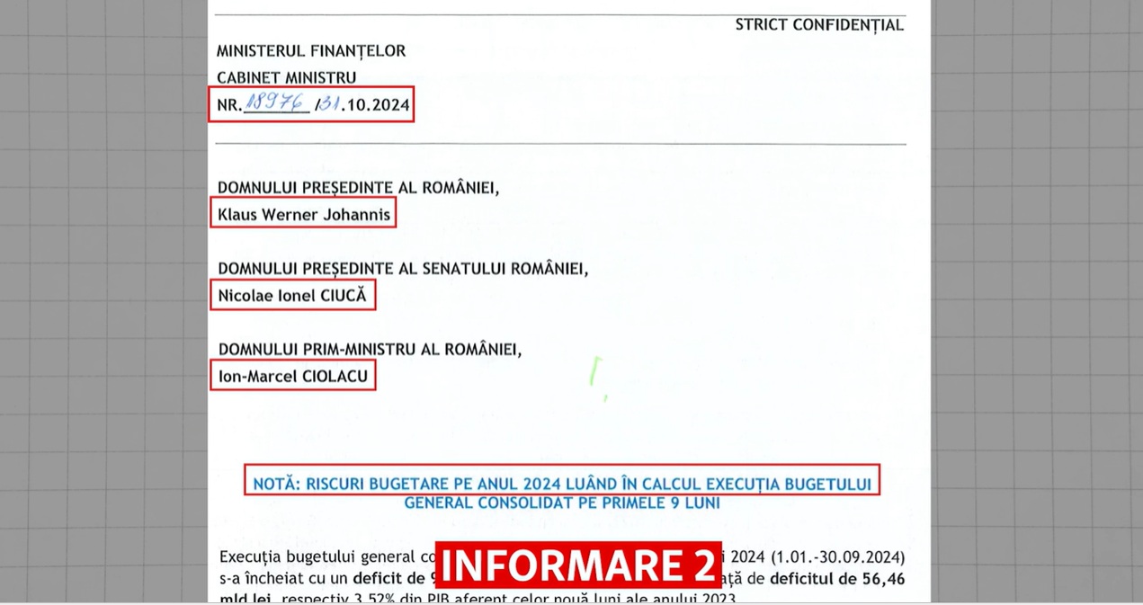 Intitulat „Riscuri bugetare pe anul 2024 luând în calcul execuția bugetului general consolidat pe primele 9 luni” – documentul semnat de ministrul de Finanțe Marcel Boloș, secretarii de stat Alin Andrieș și Dana Pescaru, precum și de șefa ANAF, Nicoleta Mioara Cârciumaru, atrăgea atenția că finanțele României sunt în picaj.