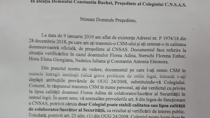 Membrii colegiului CNSAS îi reproșează lui Constantin Buchet că adresa transmisă CSM pe 28 decembrie 2018, referitoare la situația verificării Adinei Florea și a altor patru persoane, ”ridică grave probleme de ordin legal”. Ei îl acuză pe președintele CNSAS că și-a depășit atribuțiile prevăzute de lege, substituindu-se Colegiului, prin faptul că, în nume personal, a dat verdictul cu privire la lipsa calității Adinei Florea și a altei persoane de colaborator / lucrător al Securității.