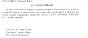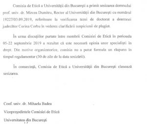 ”Din motive organizatorice, comisia nu a putut formula un răspuns în timpul regulamentar (30 de zile de la data sesizării). În consecință, Comisia de Etică a Universității București clasează sesizarea”, este parte din ”Punctul de vedere” al Comisiei trimis atunci profesorului Dumitru.