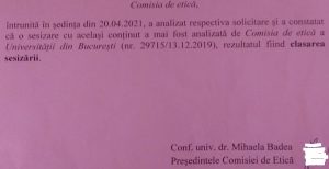 În noile condiții, Comisia nu mai avea, teoretic, vreun impediment de timp în a analiza dovezile într-un timp rezonabil, pe fond. Surpriză, însă: Comisia a clasat din nou sesizarea, după doar 6 zile, pe 20 aprilie 2021, motivând că ”o sesizare cu același conținut a mai fost analizată de Comisia de Etică a Universității București (nr. 29715/13.12.2019) rezultatul fiind clasarea sesizării”.