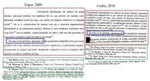 O altă sursă nespecificată de Corbu a fost o lucrare din 2009 (cu un an înainte ca judecătoarea Corbu să-și susțină teza) a Roxanei Topor, cadru didactic la Universitatea Spiru Haret din Constanța. Corbu a mers atât de departe încât a preluat integral un fragment în care Topor își exprima o opinie personală, folosind pluralul modestiei.