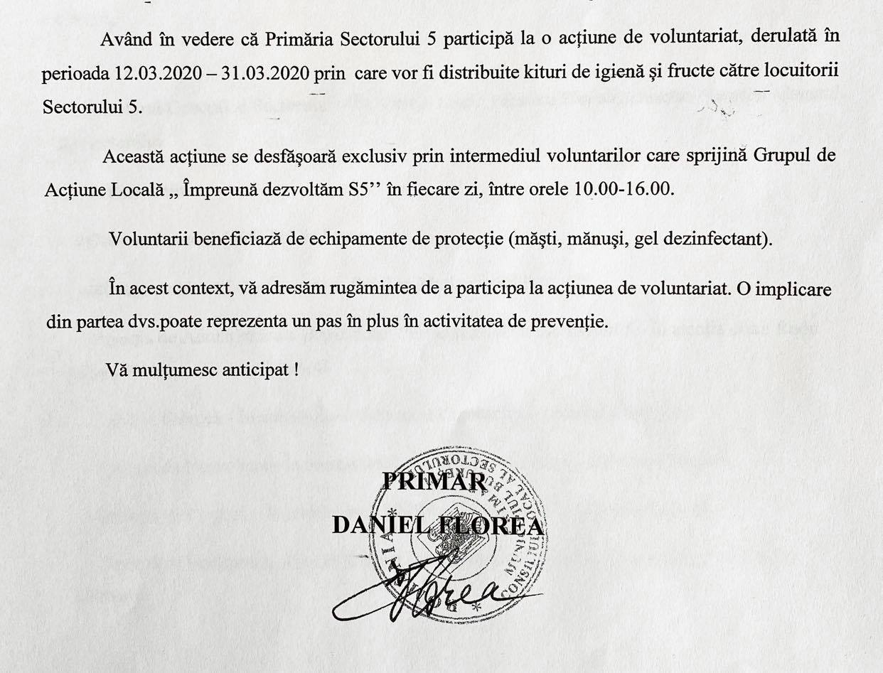 O notă internă din Primăria Sectorului 5 din București, consultată de G4Media.ro, arată cum primarul PSD Daniel Florea le cere angajaților să facă voluntariat pentru distribuția de ”kituri de igienă și fructe” către locuitorii din Sector.