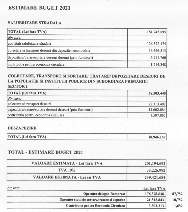Romprest estima la începutul anului un buget de 201 milioane de lei (239,42 milioane de lei cu TVA), din care doar salubrizarea era estimată să coste 151,7 milioane de lei, în timp ce colectarea, transportul și tratarea deșeurilor erau estimate la 38,5 milioane de lei, iar deszăpezirea 10,9 milioane de lei.