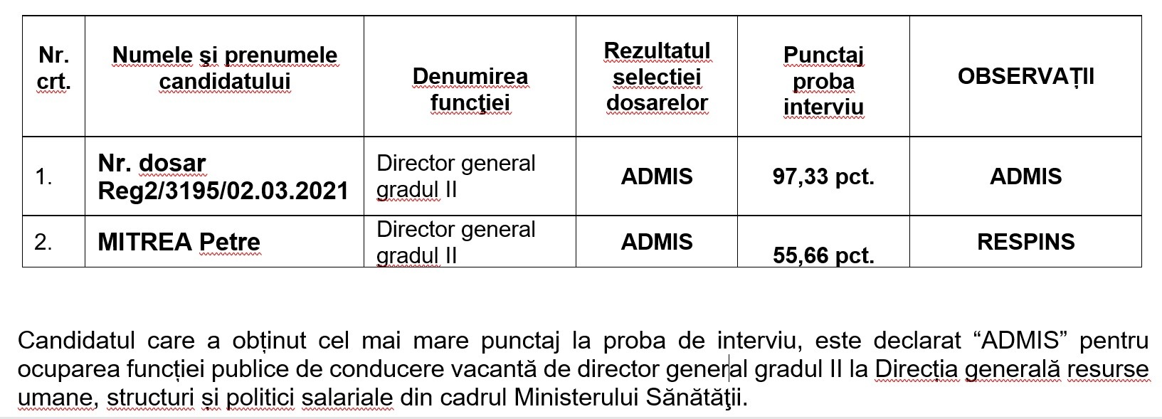 În cadrul Ministerului Sănătății au mai fost organizate proceduri de selecție, în conformitate cu prevederile OMS nr.905/2020, iar pe site-ul instituției se regăsesc listele cu rezultatele selecției unde apar doar numerele de înregistrare ale dosarelor de candidatură, indiferent de natura postului, de execuție sau de conducere.