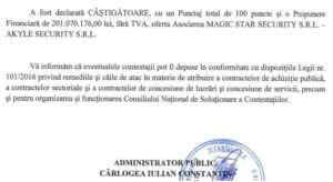Singura ofertă admisibilă a rămas cea a Magic Star Security-Akyle Security care a obținut punctajul maxim – 100. Drept urmare, această ofertă a fost desemnată câștigătoare pentru suma de 201 milioane lei, fără TVA.