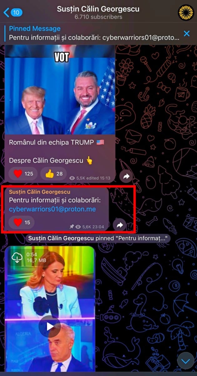 Pe alt canal de Telegram cu peste 6.700 de membrii, administratorul, care apare în conversație „Susțin Călin Georgescu” anunță sec într-un mesaj că „pentru informații și colaborări” este disponibilă adresa „[email protected]”. „Cyber warriors” sugerează „luptătorii cyber” sau „ai Internetului” numele fiind de obicei asociat cu o grupare anonimă. Iar asta mai ales pentru că domeniul „proton” de poștă electronică indică un server criptat de mailuri, din Elveția, potrivit descrierii acestuia, care securizează la niveluri multiple informațiile primite și trimise.
