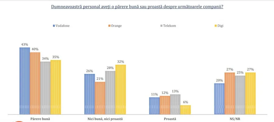 43% dintre respondenți au o părere bună despre Vodafone și doar 11% au o părere proastă despre această companie. Totodată, 40% au o părere bună despre Orange, în timp ce doar 12% au o părere proastă. 35% au o părere bună despre Digi și 6% au o părere proastă. În schimb, doar 34% au o părere bună despre Telekom și 13% au o părere proastă.